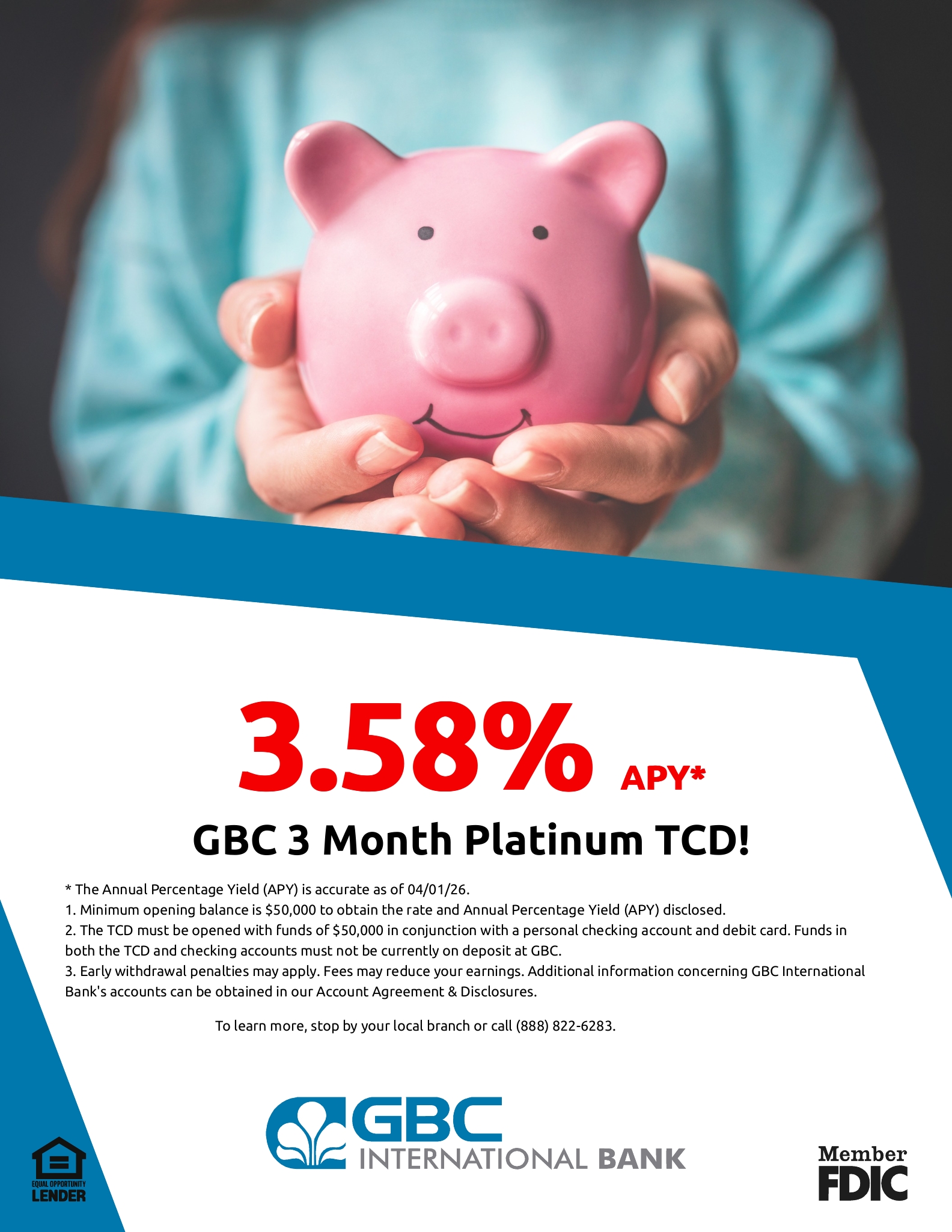 3. Early withdrawal penalties may apply. Fees may reduce your earnings. Additional information concerning GBC International Bank's accounts can be obtained in our Account Agreement & Disclosures.